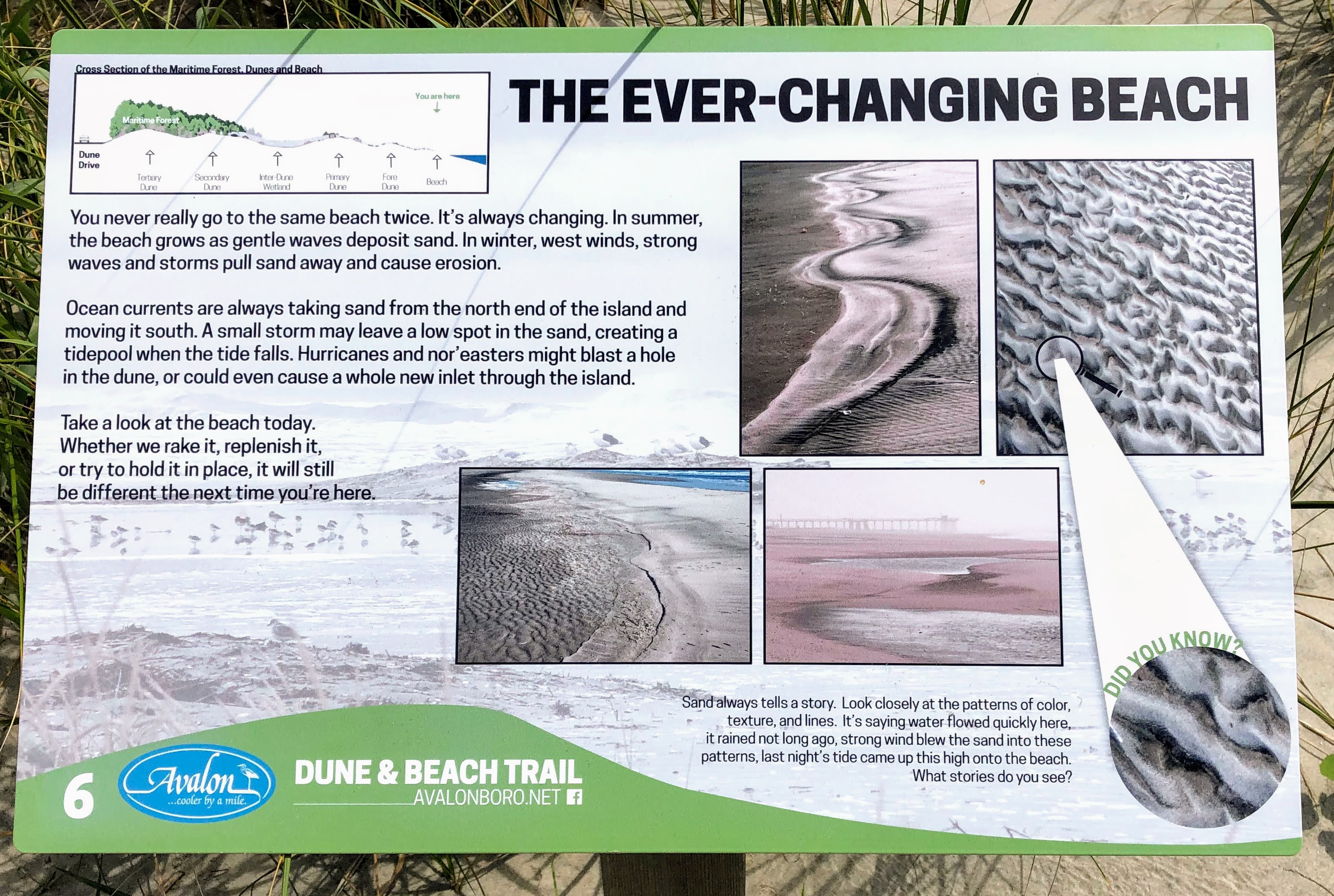 The barrier island in the southern part of the Jersey Shore that includes the towns of Avalon and Stone Harbor is known for its dunes, protecting the beaches in these towns from wind and wave damage. What is unique about these dunes is they are in their natural state. In most other places the dunes have been leveled off to support development of the resort areas. The Avalon/Stone Harbor dunes offer a rare look at what the Jersey Shore looked like before the hotels, the beach houses, the boardwalks and amusement piers.