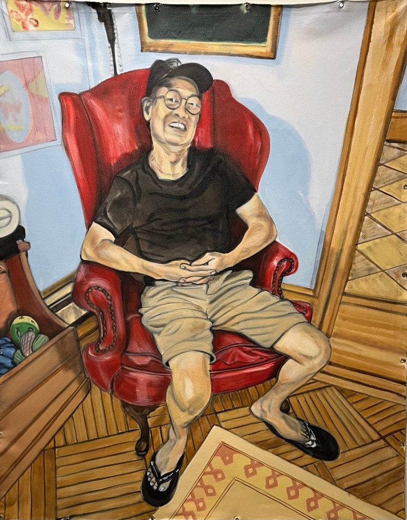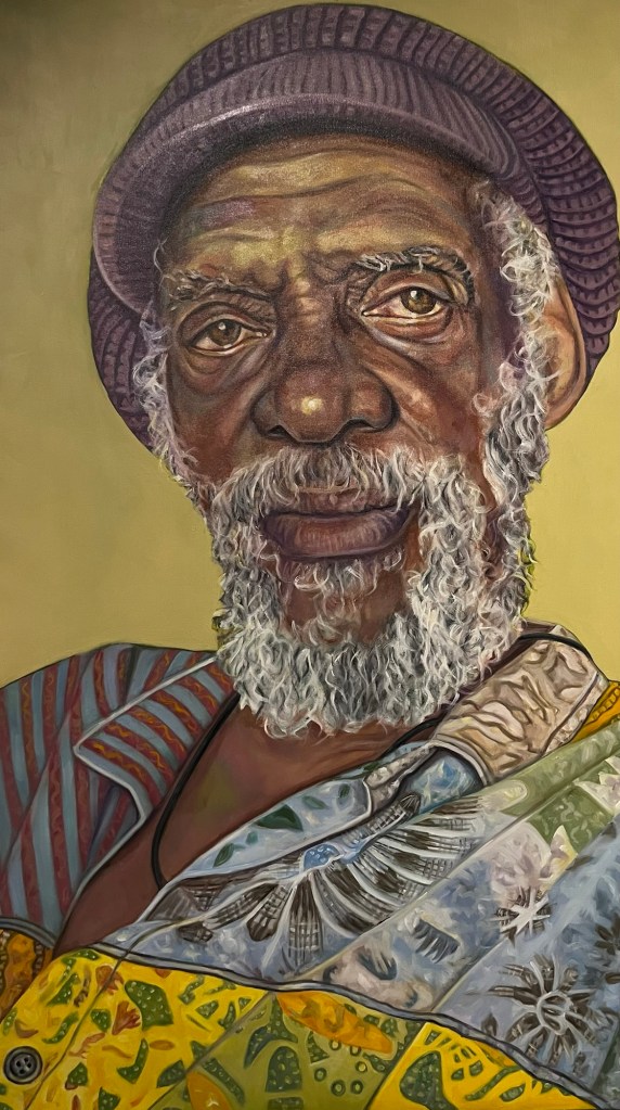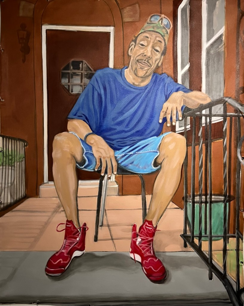 Mom, Copie Rodriguez (Garfield). Rodriguez’ portrait of his mother includes a family tree with family photos. “I wanted to preserve my mother’s memory and our connection to our roots and humble beginnings.”Una historia gringa, Jonathan Yubi Gomez (Bergenfield). A construction crew on the tracks of 86th Street Station in Manhattan. “Two workers gore a klansman, a third holds his hood, and others brandish pikes. Two flags wave gallantly — one representing my motherland, the other my fatherland.”Road Trip, Janice Belove (Montclair).”A few years ago, our family took a three-week cross-country road trip… The mega-mess in the minivan created a record of the family on the go, in the confined space.”La Rogativa, Brandon Bravo (Metuchen). “The imposing figures casting shadows over my cousin symbolize the iconic statue La Rogativa, located in Old San Juan, which commemorates a women-led religious procession in 1797. La Rogativa is a tribute to Puerto Rico’s enduring spirit and a reflection of our collective journey.”The Handshake, Johanna Foster (Montclair). “In this painting, I render a gesture of deep connection between my husband and our infant daughter, an image taken from a nearly 25-year-old photograph…My sister and brother-in-law…together apart!, Susan Sinek (Fort Lee). “My sister and brother-in-law…are posing on a bench in Morocco…very staid and serious…they are both very successful. They are very much together and in their work they are very much apart.”James Oliver Jones, Jr., Grace Graupe-Pillard (Keyport).”I met James Oliver Jones, Jr., on a street in the East Village in 1985. Forty years later we reconnected on social media and I found him as powerful and beautiful a presence now as he was then.”Before Leaving, Meira Pomerantz (Fort Lee). “ The linoleum cut print..presents a familiar image of a mother enfolding and being embraced by her children. It is statement of human emotion and caring between the individuals.”The Global Village Series #1, Mesma Belsari (Guttenberg). “I consider the world a village where families and communities are perpetually in flux. Global Village Series #1 is a continuation of that idea in pen and ink. The pen dreams in ink.”Nido and Smidoo, Ben Goldman (Weehawken). “My two portraits in this exhibition provide a snippet of the great diversity of my Northern Hudson County community. My friend Nido Gula lives in a neighboring town and cleans my home. My friend and neighbor Arthur ‘Smidoo’ Smith is often called the mayor of this block.Code Switching Mask, robin holder (West Milford). “…almost all successful people of color practice code switching. It is an innovative, often obligatory, strategy of successfully navigating the workplace, society, and social platforms that are predominately white, privileged and empowered.”Black Mirror, Kristin Kunc (Atlantic Highlands). “Black Mirror is inspired by the news, media, and complacency. It is a painting of my son, though it could be any child or oneself, and what is colloquially known as the television, aka the black mirror. Rather than go outside and enjoy a beautiful day, we are trapped by our own reflections, our own insecurities, and our own black void of overbearing information and entertainment that we sit silently waiting and watching.”Just Tell the Truth (LOOK!), Lawrence Ciarallo (Hoboken). “I wanted to create a graphic that would address the long and sordid yet passionately determined history of the United States. The multicolored background and flowers are intended to convey that beauty. It has always existed and persevered despite many obstacles.”CITYSCAPE-UPHEAVAL, Grace Graupe-Pillard (Keyport). “CITYSCAPE-UPHEAVAL communicates my visceral response to a world where black lives are ‘obliterated,’ fighting for the very rights that the Constitution bestows upon all Americans.”The Invisibles: Sanctuary City, Karen Cunningham (Princeton). “The Invisibles portrays recent migrant arrivals to New York City, bused in from New Jersey, mixing into the urban landscape with the city’s longstanding homeless population.”Tomas, Danielle Scott (Jersey City). “Tomas is the visual interpretation of the beautiful relationship between Angola and Cuba. Tomas is a depiction of joy, pain, and courage. Tomas is our history. The images behind Tomas are old slave markets in downtown Luanda, Fortaleza de Sao Miguel (where slaves were rolled from the top of the Fort to the bottom landing on Flores street).”4 Fashion Girls, Maria Mijares (Plainfield). “4 Fashion Girls depicts my friends Yvette and Deanna in a fitting room next to framed wall decor 50s looking photograph of two models. The style of the past contrasts the fashion of our day.”