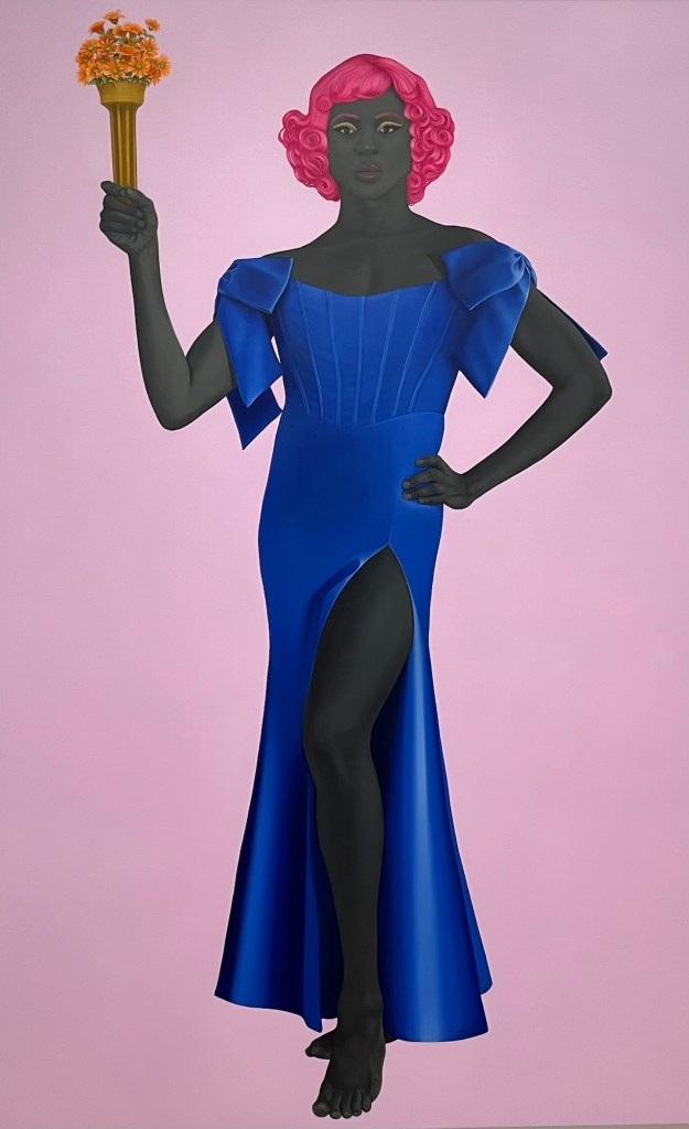 Amy Sherald is perhaps best known for the above portrait of Michelle Obama. It is the official portrait of the First Lady. Sherald paints images of everyday Black Americans. Her works are currently on display at the Whitney Museum of American Art. The exhibit is titled “American Sublime.”