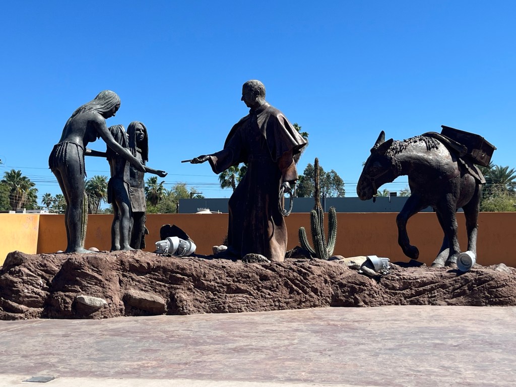This sculpture portrays Father Juan Maria de Salvatierra, the founder of the mission at Loreto, with indigenous Cochimi people.